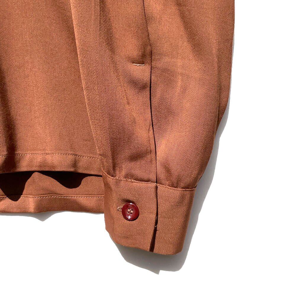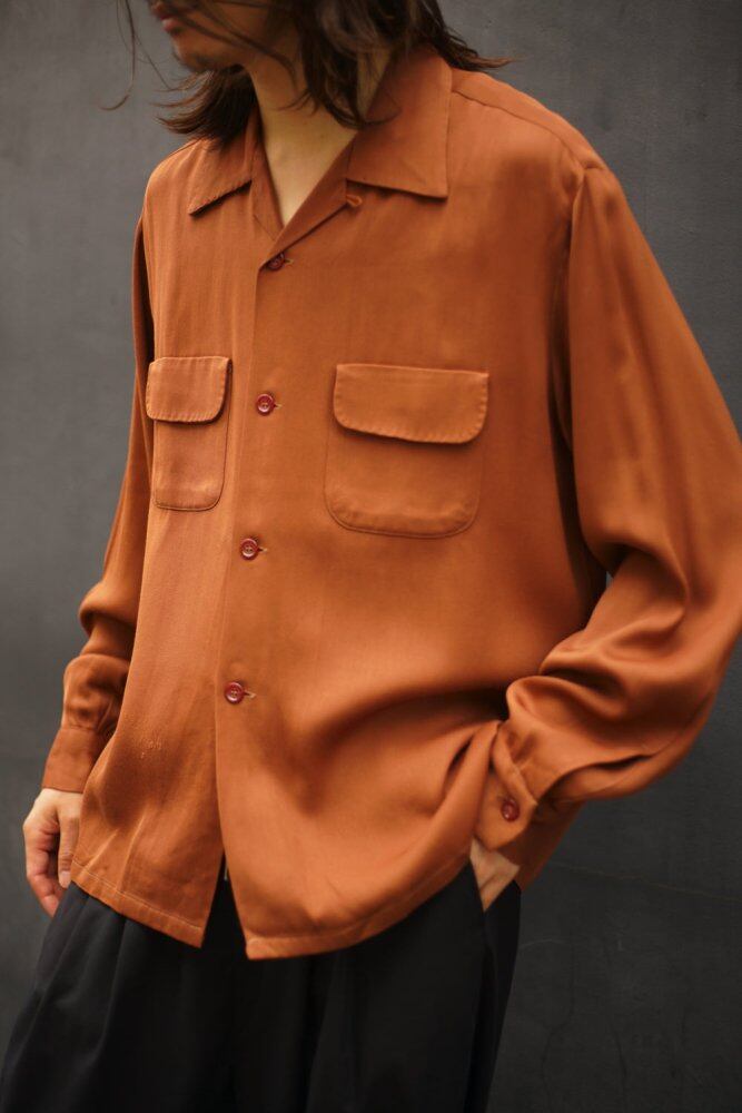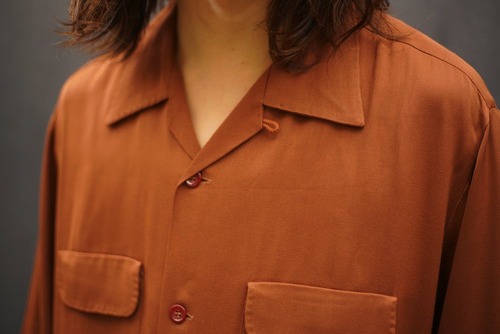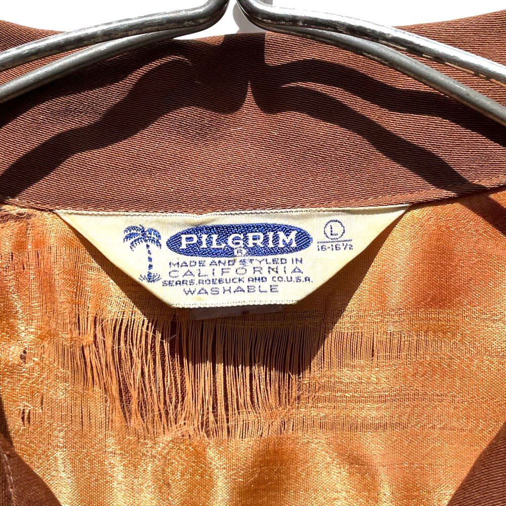 Around the 1950s, it is a rayon gabardine open collar shirt made by PILGRIM.