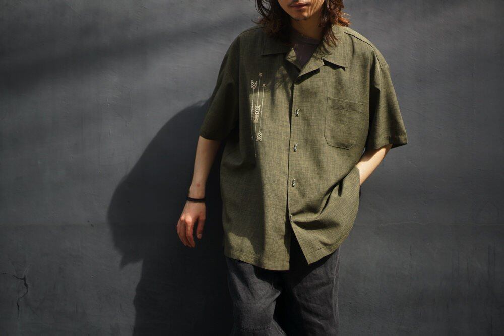 Around the 1980s, it is a tiki embroidery open collar shirt with a light texture that feels like it contains air.