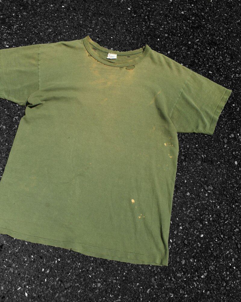 1980s champion jersey t-shirt. The well-colored body has been aged and damaged, and it has a vintage-like appearance that gives a sense of unevenness and depth. The 100% cotton fabric has a thick and comfortable texture. A rare XL size with a moderately relaxed silhouette. Since it is an old item, it rarely deteriorates over time. Please check the photos and understand the vintage characteristics before purchasing.