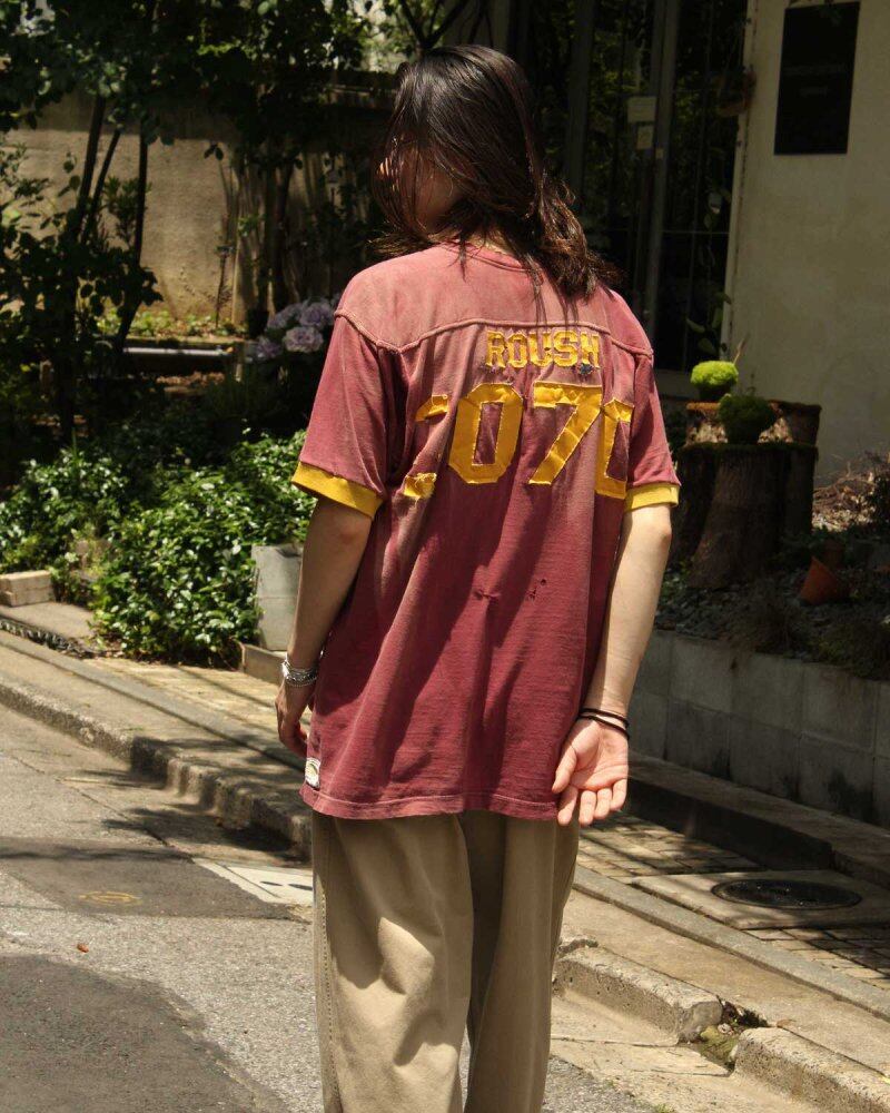 Early 1970s Russell jersey T-shirt. The overall aged body has a vintage texture, and the damage has been repaired by hand at our shop to make the damage more noticeable. The cotton fabric (may contain rayon) has a thick and comfortable texture. The XL size has a well-balanced silhouette that does not feel cramped. Since it is an old item, it rarely deteriorates over time. Please check the photos and understand the vintage characteristics before purchasing.