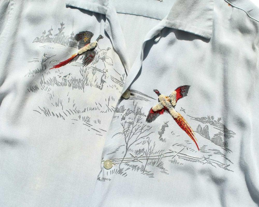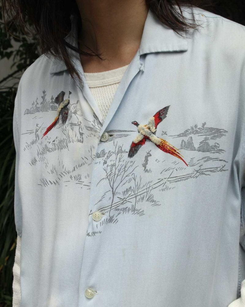 Open collar shirt from the 1950s. The unique drape and smooth rayon fabric give it a comfortable texture. The mint blue body has aged over time and has a vintage look with a sense of depth. It is a rare individual full of originality with a handwritten print and felt on top of the print. Moderately roomy silhouette in medium size. Since it is an old item, it rarely deteriorates over time. Please check the photos and understand the characteristics of vintage before purchasing.