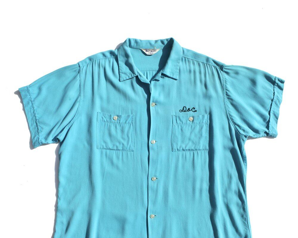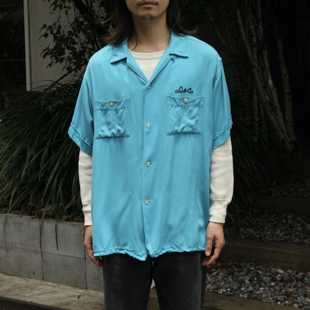 Bowling shirts up to the 1960s were made of rayon fabric, and this is a medium-weight gabardine fabric with a thicker texture. A beautiful individual with a vivid mint blue that jumps into your eyes. The orange embroidery on the back is also a color scheme that looks like the 50s with a coloring that shines on the body. The silhouette is probably larger than XL and has a loose and relaxed silhouette. It is in good condition as a used item. Since it is an old item, it rarely deteriorates over time. Please check the photos and understand the characteristics of vintage before purchasing.