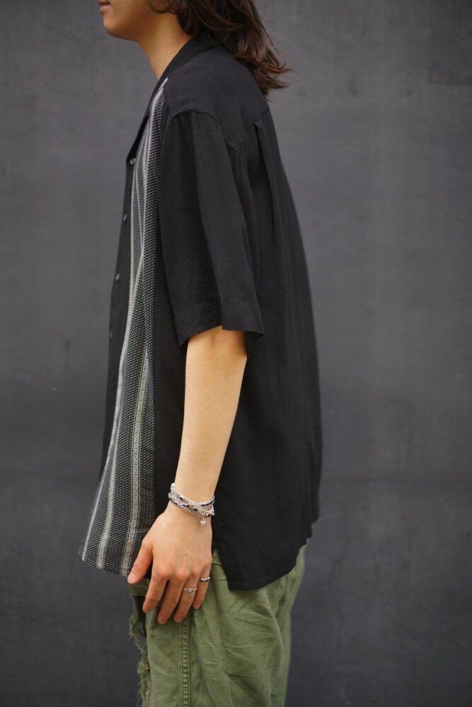 The striped patterned fabric has a panel on the front to create an ethnic taste design like a Cuban shirt, and the 50s vintage style box silhouette enhances the atmosphere.