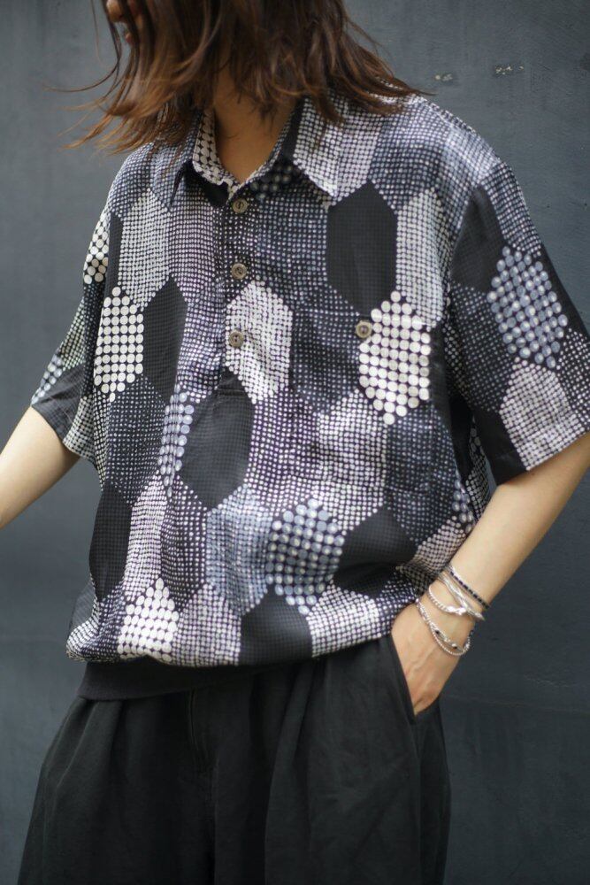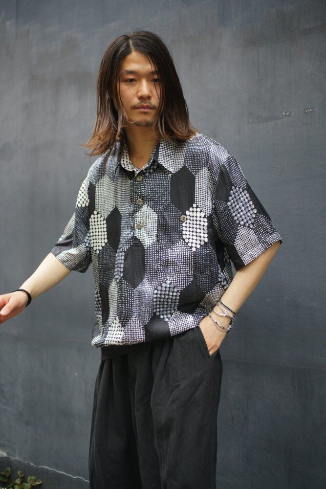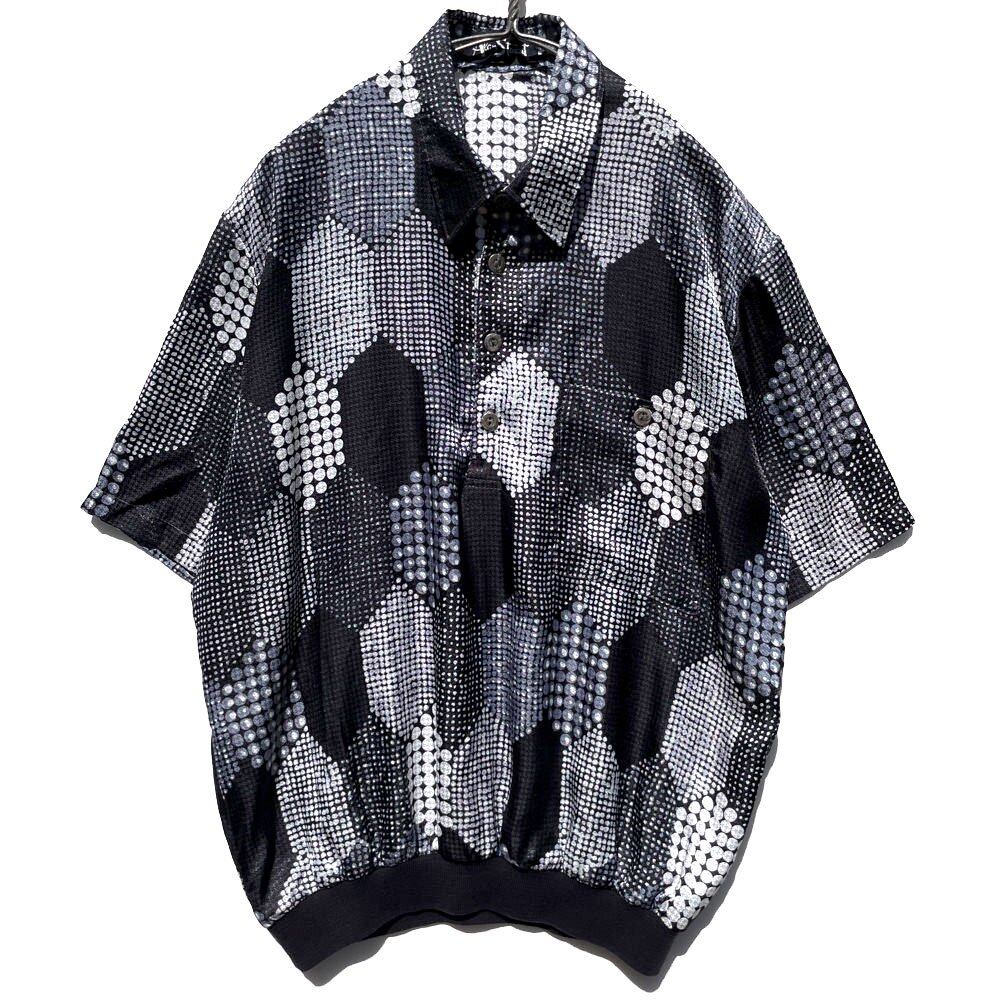 A stylish artwork with a rockabilly and ska taste, with various large and small dot patterns scattered in diamonds, and an old-fashioned ribbed shirt with a fabric texture that sublimates into an urban outfit.