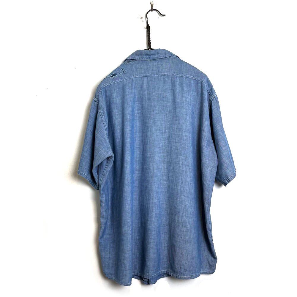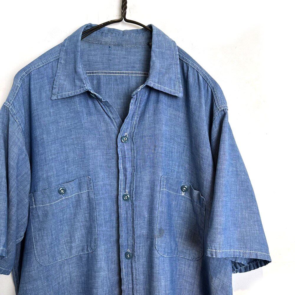 Short-sleeved chambray shirt from the 60s 100% cotton chambray that has softened over time and has a vintage-like texture with damage repair marks on the shoulders. One piece with a good size