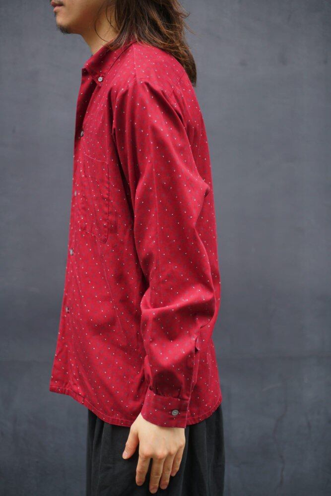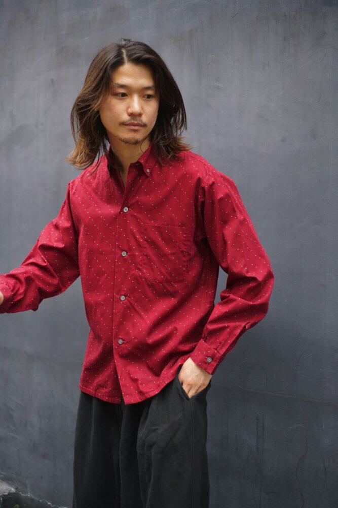 A delicate all-over pattern with an oriental mood, and a special button-down design without a collar band that creates a vintage presence and an elegant impression.
