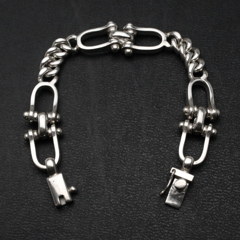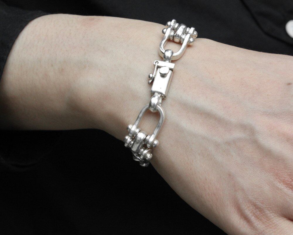 Made in Taxco, Mexico, one of the worlds leading silver mining areas, where many silver artists and craftsmen have gathered since ancient times. It is a vintage that has been attracting attention in recent years with its own evolution with a design like Native American jewelry that shows the influence of Southwestern America from the native Aztecs, and the sophisticated minimal design of Scandinavia. This one has an industrial feel to it, like a carabiner connected to it. Since vintage silver jewelry is gaining popularity all over the world, especially heavy chain bracelets are in short supply in any vintage. Probably circa 1990s, Mexico-925 silver stamped. Stamped by Descorcia, a company based in Taxco. Since it is an old item, there are scratches, etc. Please check the photos and understand the characteristics of vintage before purchasing.