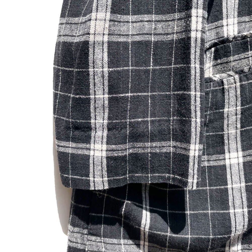 A blend of linen and rayon with a unique crispness is used, and the drape becomes softer over time and fits the body.