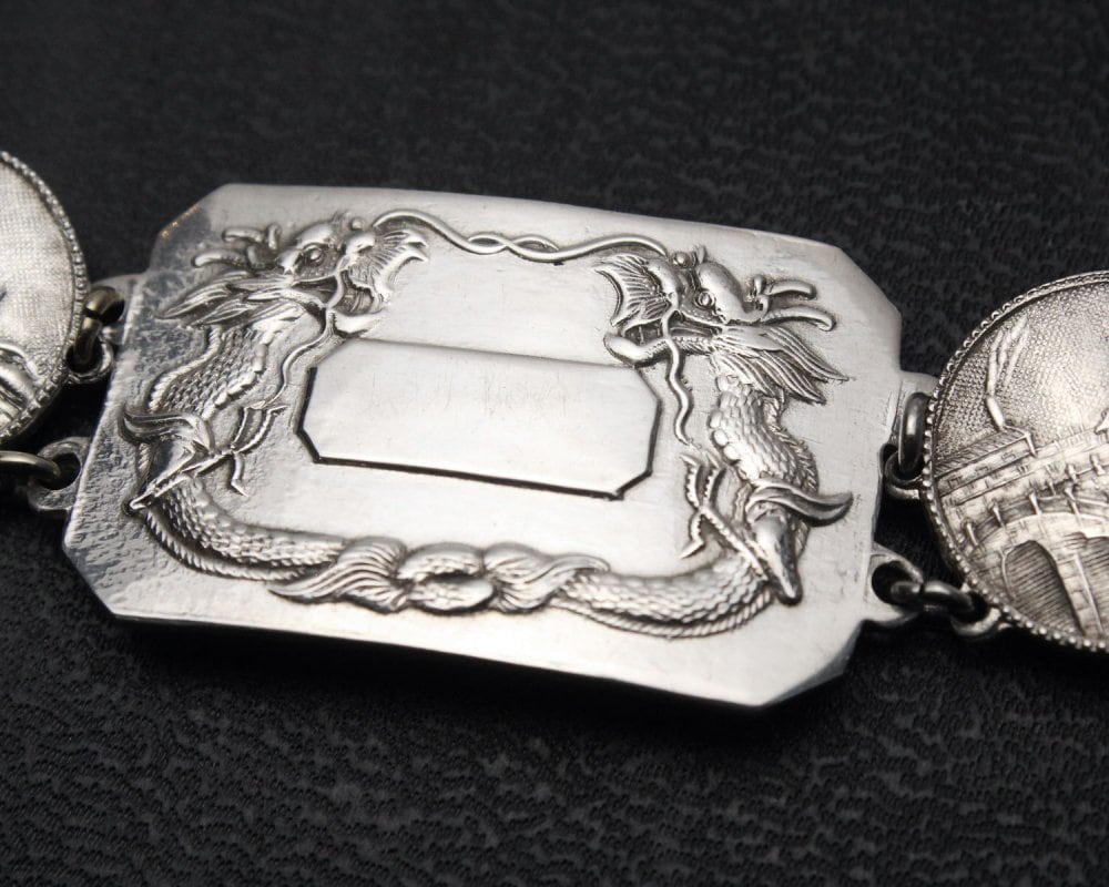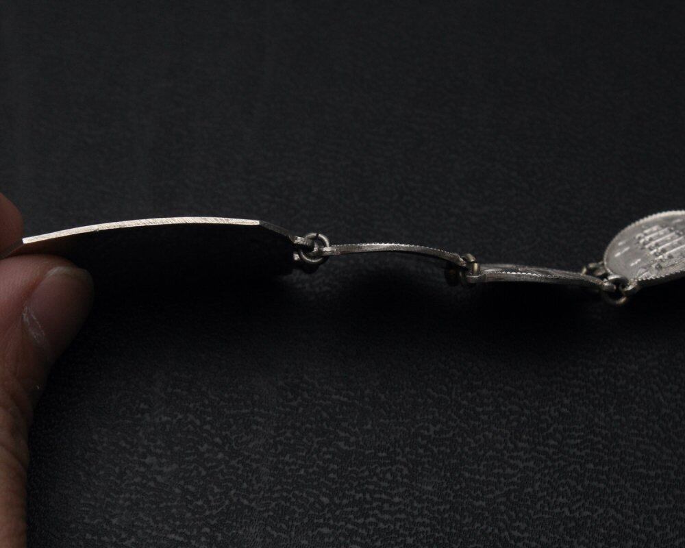 A chain bracelet probably made as a souvenir from China around the 1950s. The symbolic coin and central plate are connected to the design, and it looks like an old military sweet heart, an ID bracelet. It is an individual that shows an elegant presence with a solid structure. A carved seal of SILVER. Since it is an old item, there are scratches, etc. Please check the photos and understand the characteristics of vintage before purchasing.