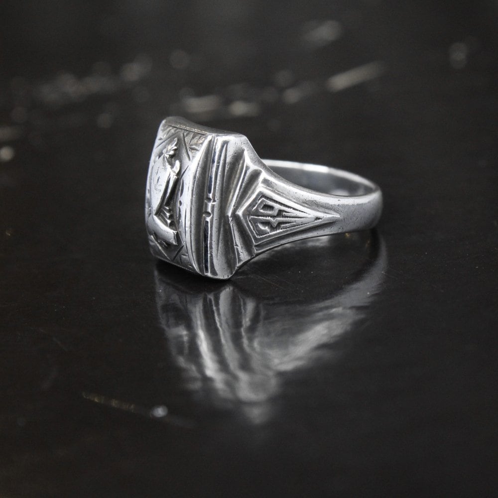 Vintage class ring from 1939. It has a dignified silhouette that is typical of this age, and it has a minimal and more signet ring look. After the Great Depression, many of the class rings until the beginning of World War II were sterling silver and brass, and this is also sterling silver, giving it a more rugged look and an antique look. Please check the condition in the photo and understand the characteristics of vintage before purchasing.