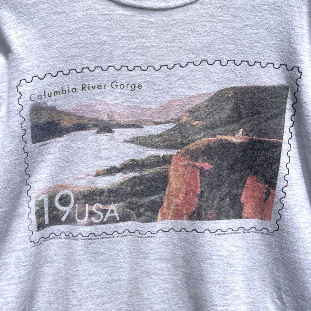 A vintage stamp design depicting the scenery of Columbia River Gorge in Oregon is printed, and the artwork is impressive with a mysterious location.
