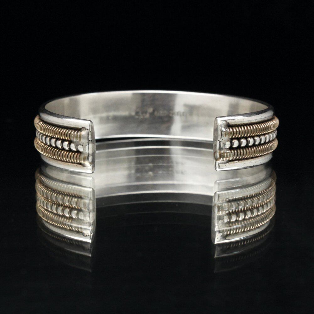 Bangle by Navajo artist Franklin Verna/Tahe. It has been made since the 1980s, and even today, the family name / Tahes work is produced by the family, and the design is characterized by the use of wire. This is probably a piece from the 1990s, with a gold-plated coil and a heavy plate that gives it an elegant look. It is a familiar individual with a firm fit. Please check the condition in the photo and understand the characteristics of vintage before purchasing.