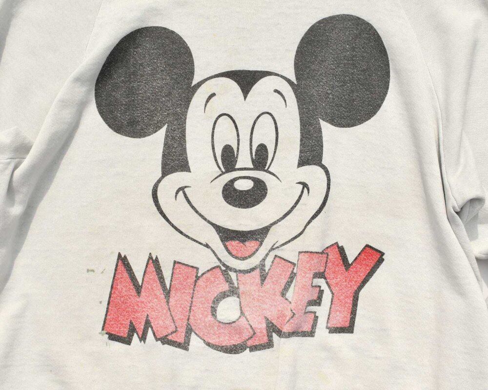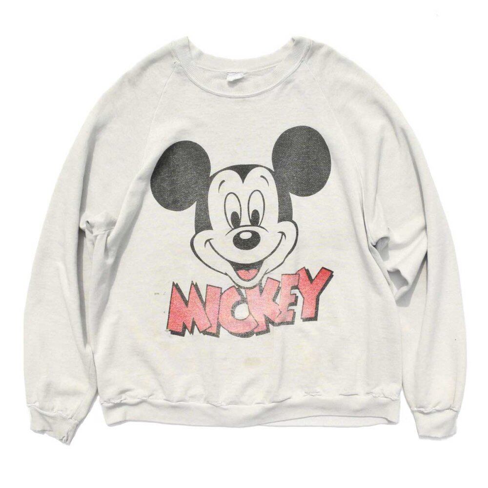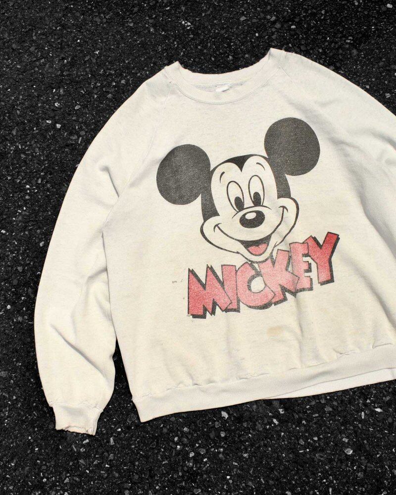 1980s Disney original Mickey print sweatshirt. The cotton/polyester fabric has become thinner over time, giving it a thicker, softer texture. The overall aging condition is a vintage piece with a good atmosphere. A loose silhouette that is rare in this age that makes you feel small, and a size that makes you feel more alive with aging. A shade between light gray and white. Since it is an old item, it rarely deteriorates over time. Please check the photos and understand the vintage characteristics before purchasing.