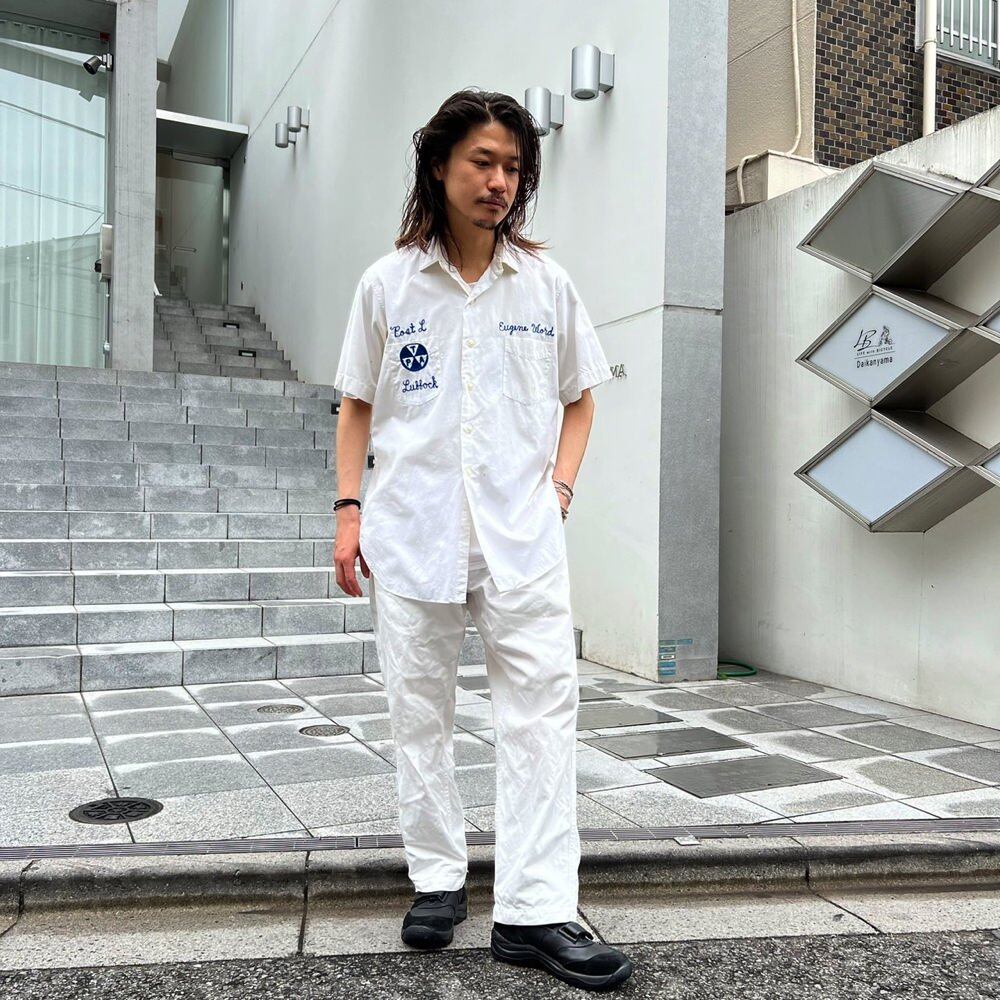 Short-sleeved work shirt from the 1960s The texture of the cotton fabric has a good taste, and the blue chain stitch embroidery on the white one piece The embroidery has a bowling shirt-like atmosphere. It is the first place that a silhouette is good for a feeling of size