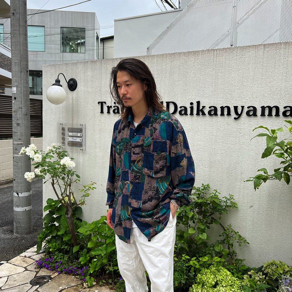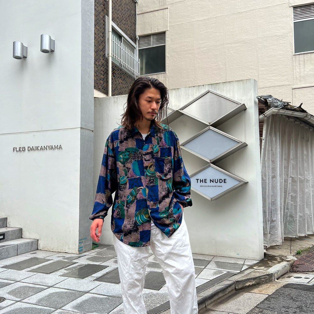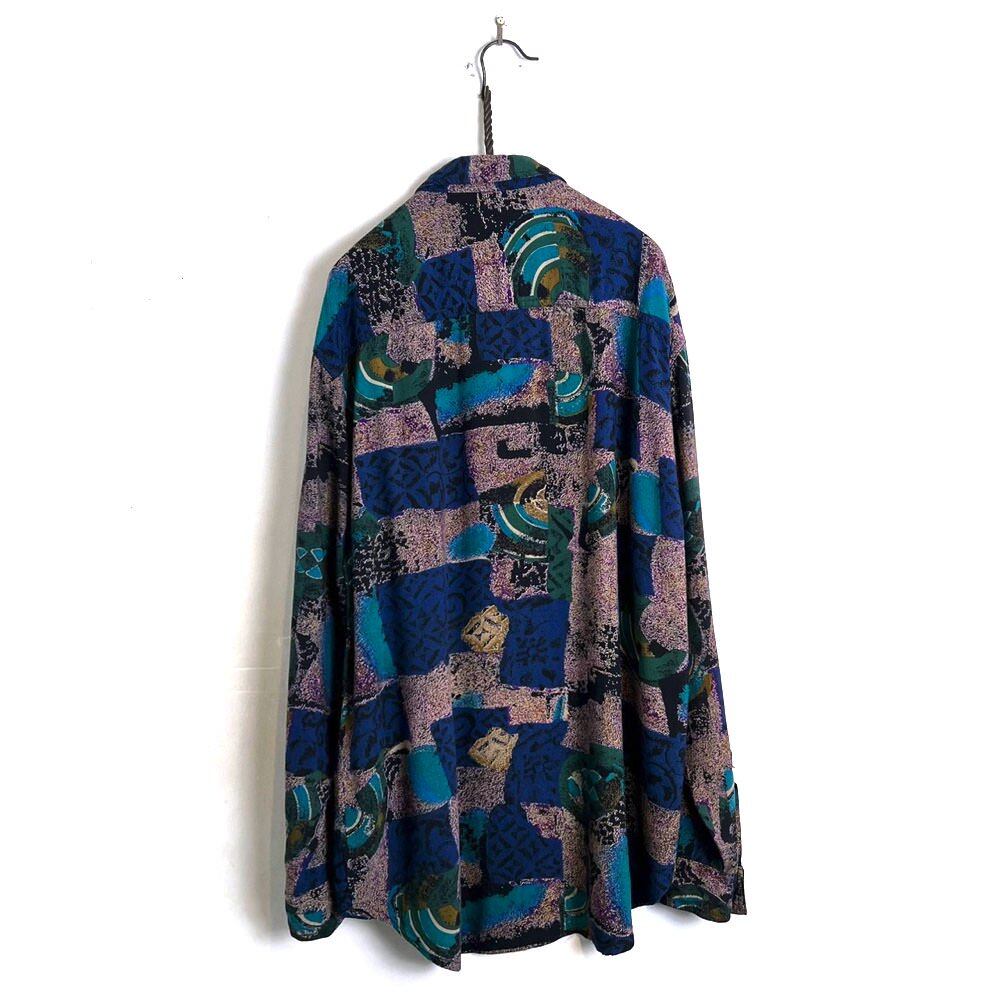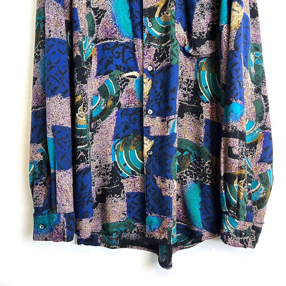 Rayon shirt from the 80s Blue, black, green on turquoise, abstract art pattern in cool, cool colors This is a comfortable piece to wear with the unique smooth and soft feel of rayon fabric.