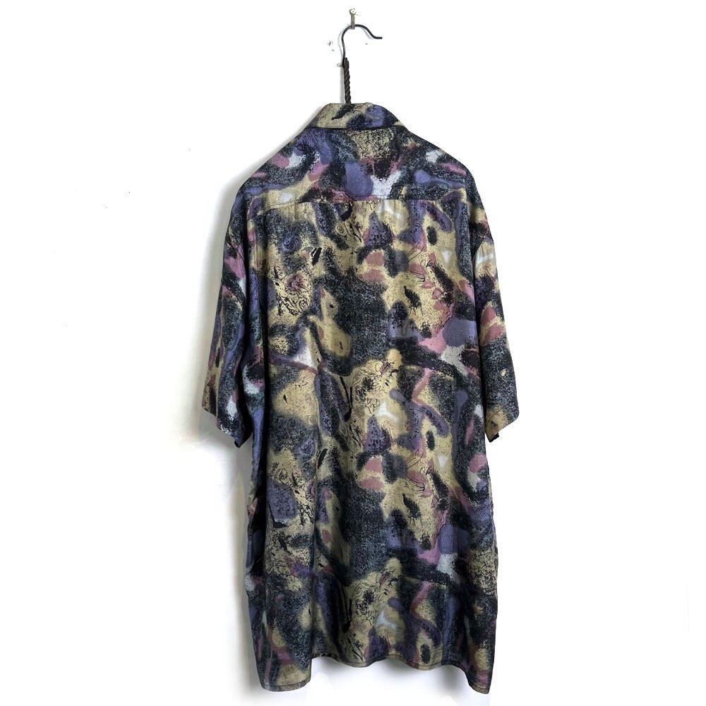 90s short sleeve silk shirt Mysterious abstract art pattern with grayish khaki, purple and navy shades