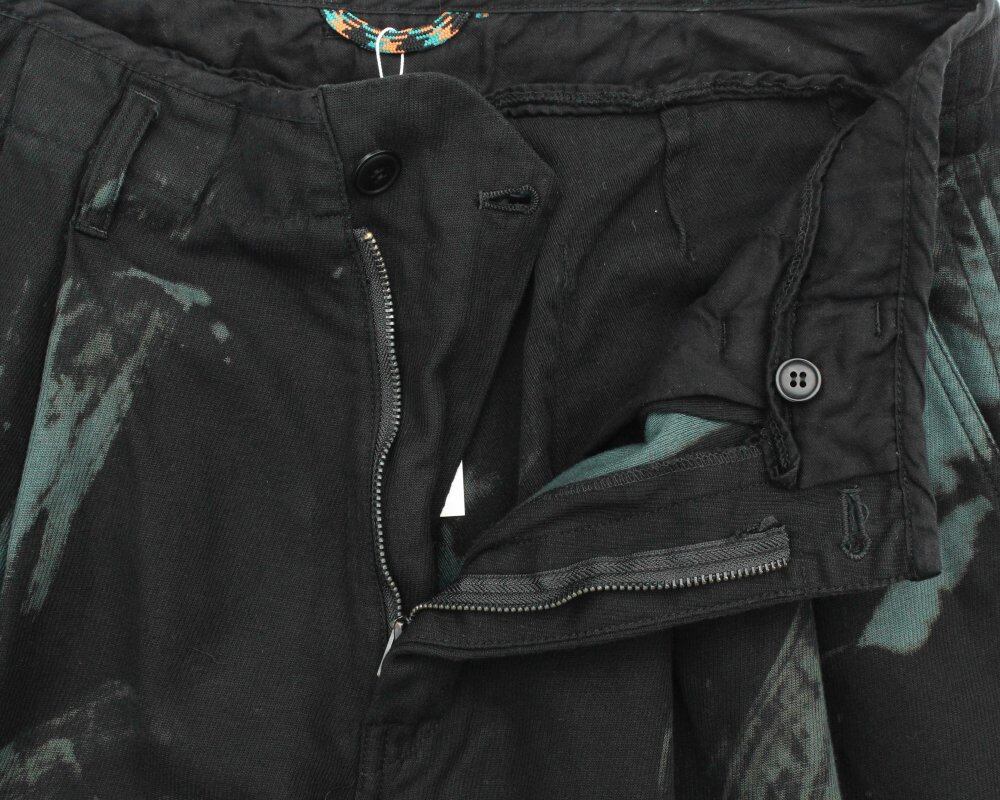 [roundabout] 2023 S/S Uses dobby drill fabric woven into a three-dimensional dobby structure using cotton and linen for a mixed weave. The fabric features a high-quality, supple texture of linen and a glossy feel, and the natural texture of the cotton blend is also attractive. Random product dyeing by craftsmen is applied, and it features a unique pattern like camouflage and paint, and the dull black turquoise color gives it a deep and elegant impression. Herringbone tape is used on the side seams and hem for a more elaborate and elegant specification. The wide silhouette and masculine flavor that have undergone minor changes since the brand was established. You can also wear it with a jacket made of the same fabric.