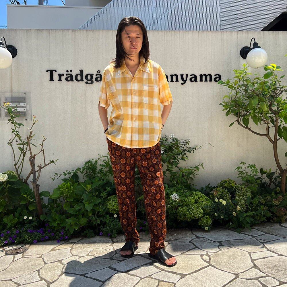 Short-sleeve shirt from the 70s Light mustard x white check pattern for a refreshing summery look. Thin and light polyester x cotton blend fabric with a smooth texture. 1 sheet