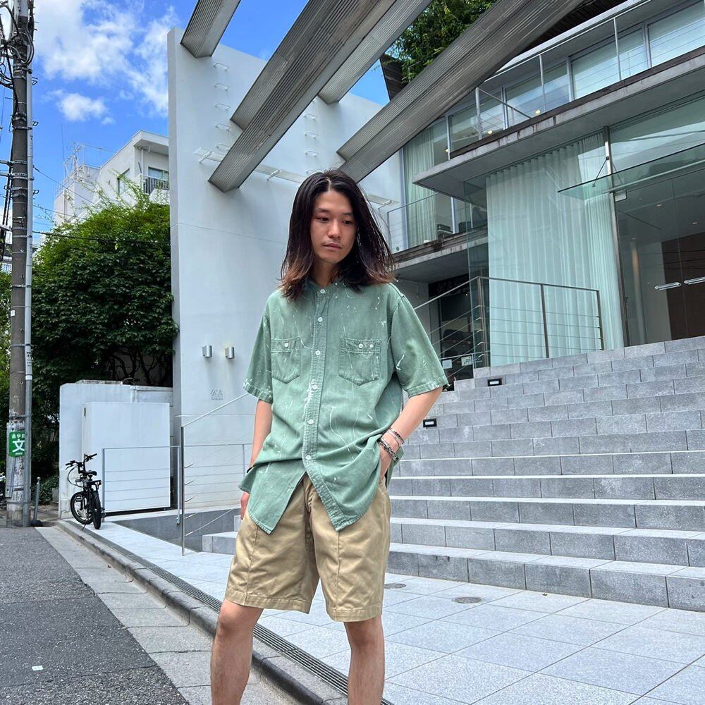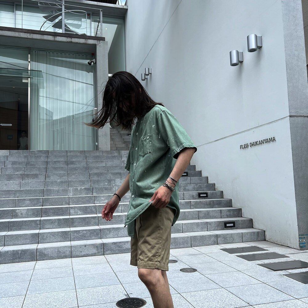 A short-sleeved shirt from the 70s with artistic white paint on a rare pale olive-colored cotton chambray fabric.