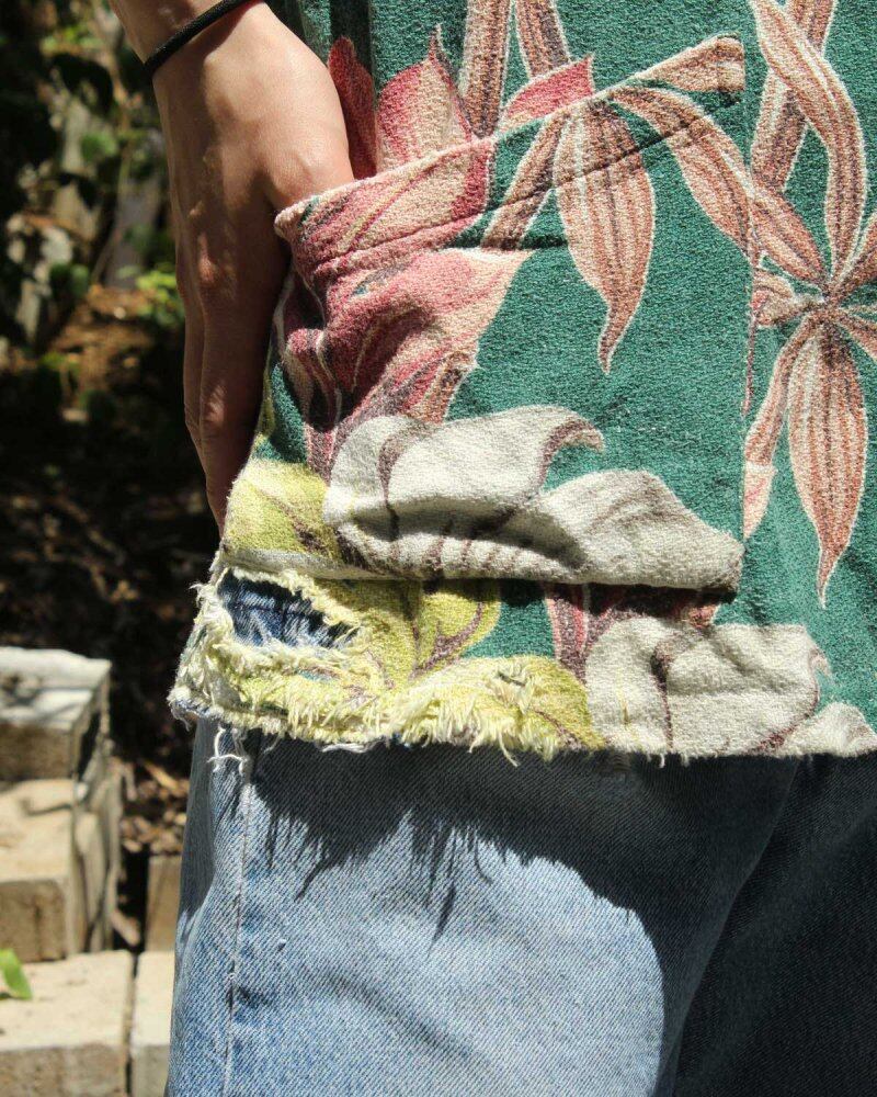 A Hawaiian shirt from the late 1940s. Random organization found in Hawaiian curtains around the 40s and 50s, high density cotton fabric like a towel blanket is used, and it has excellent moisture absorption so that it can be worn immediately after surfing. The entire body has been aged and has a good atmosphere, including repairs, and the crisp cotton fabric has a natural texture that has matured over time. The turquoise green body has a large anthurium and bamboo motif, a stylish color scheme, and an eye-catching design with an astringent look. Wongs Drapery Shoppe is a long-established shop still in Hawaii, and this is a gem that is more collectable than other vintage items, including the texture of the jacket and shirt. A relaxed silhouette that can be worn loosely. Since it is an old item, it rarely deteriorates over time. Please check the photos and understand the characteristics of vintage before purchasing.