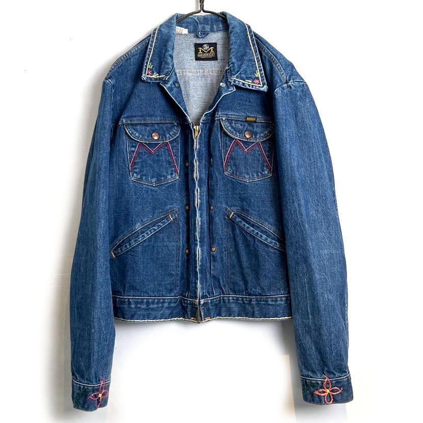 70s Maverick denim jacket Collar, both chest pockets, both cuffs and hem are hand-embroidered with flowers, giving it a cute 70s custom feel. Type of denim jacket The size notation is 46, a moderately roomy size