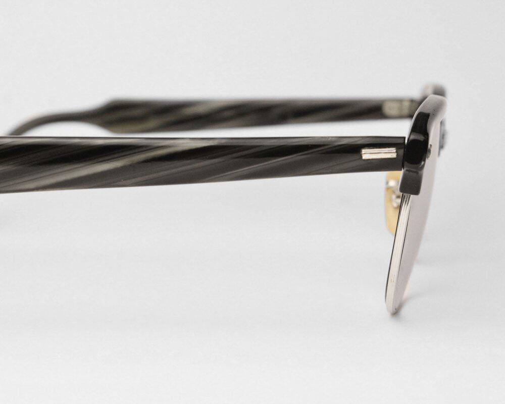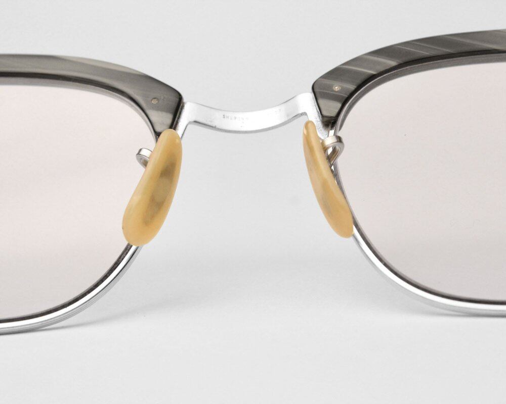 From the late 1950s, vintage [Shuron] glasses. Shuron, one of the three major American manufacturers, is the only manufacturer that continues to make fashion frames that are still popular today, such as blow-line glasses represented by Ronsir. Model Ronser was announced in 1947 and became popular, and after that, it became an opportunity for each manufacturer to sell the blow line type. The shapely body design and slender blowline give off a dignified and intelligent flavor, making it a masterpiece that can be called an eternal classic. This is a combination of minimal black x gray cell and 12KGF white gold metal that was only made until the 1960s. The frame color has a solid feeling like Ronser, and it has a heavy and luxurious impression. We have newly put in ultra-thin grayish purple UV lenses. It has been maintained at an eyewear store. The size of the temple can be adjusted according to the degree of curvature. (At a nearby eyeglass shop) Although the condition has been carefully examined, there are scratches and scuffs as this is a vintage product. Please purchase after understanding the characteristics of vintage and antique. All of our eyeglasses are maintained and lens exchanged at g room, an eyewear store in Ebisu, Tokyo.