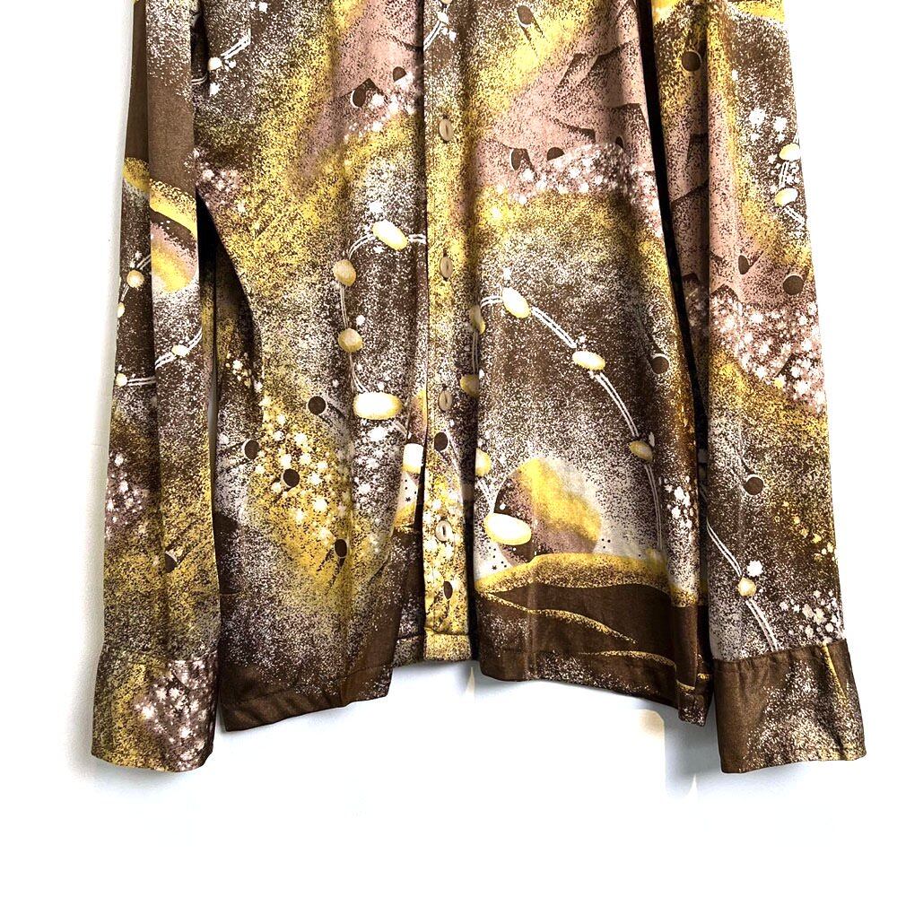 70s disco shirt Spacey planet art in a dark khaki gold color gives you a 70s psychedelic feeling.
