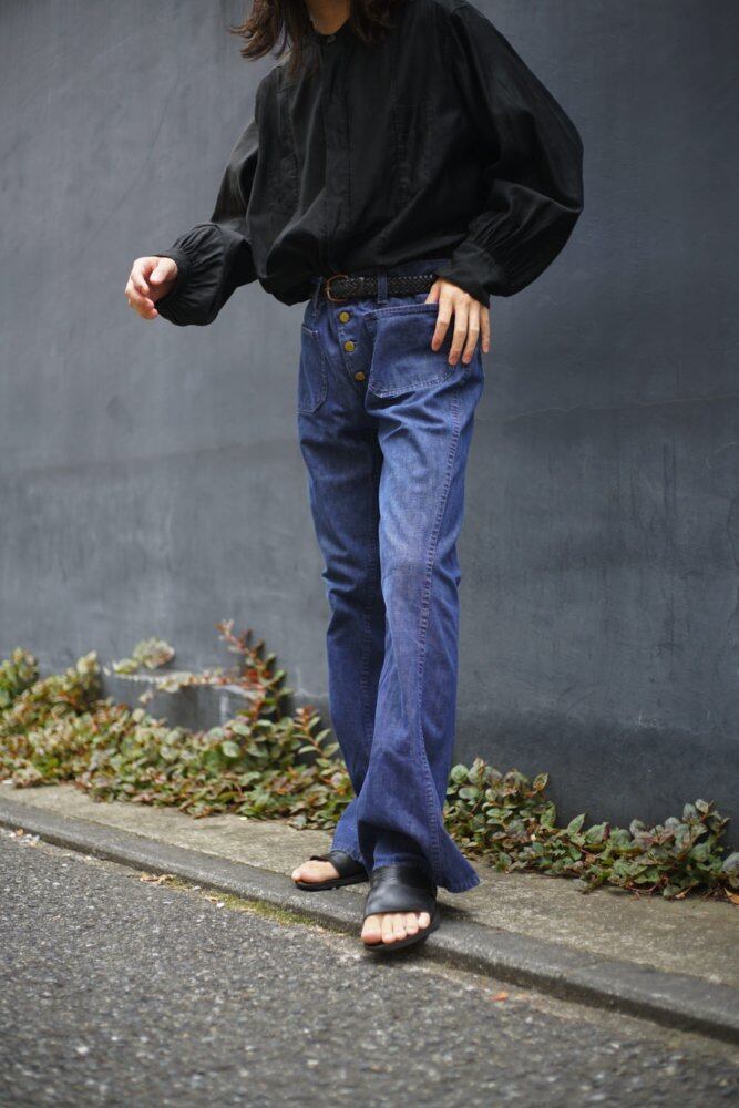 The solid coloring and sailor pants style button fly design enhances the atmosphere with a retro look.