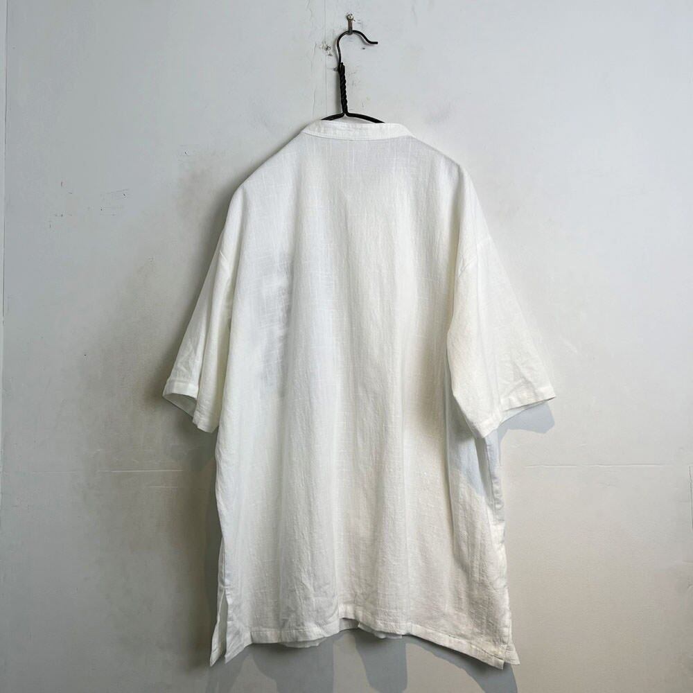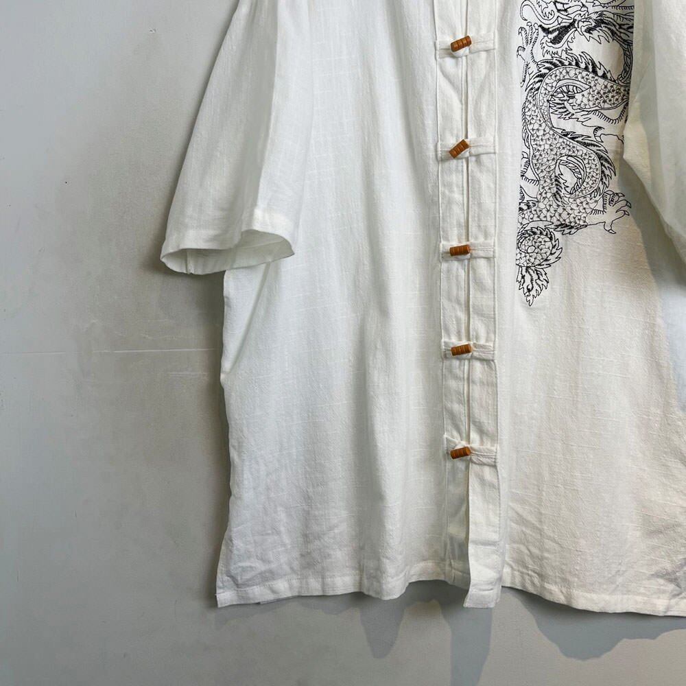 Short-sleeved Chinese shirt from the 90s Cool white cotton fabric with kasuri pattern and a dragon embroidered simply with black thread creates a nice atmosphere.