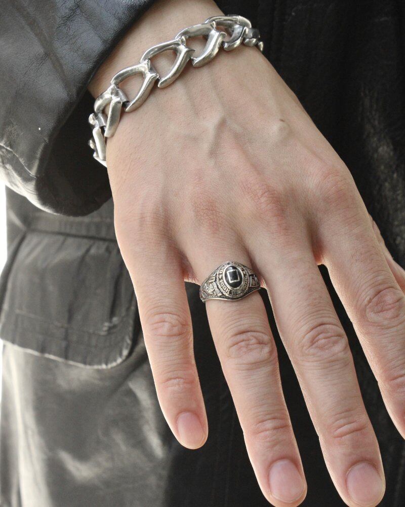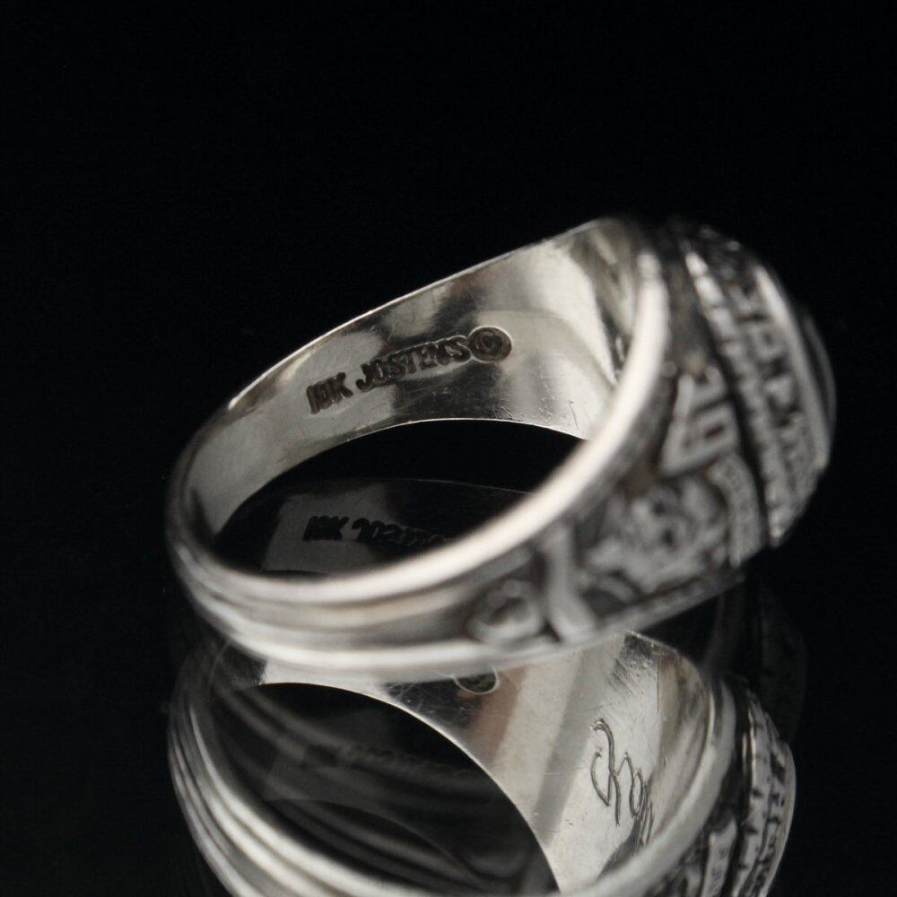 Vintage class ring from 1980. An individual with a rare solid feeling with onyx on the hump top and square inlay in the center. The side has a team motif and a devil design, making it a highly designed item that is unique to this item. It is an item that goes well with other silver accessories with a solid white gold specification. Well-established Justin company, a carved seal of 10 carat gold. Please check the condition in the photo and understand the characteristics of vintage before purchasing.
