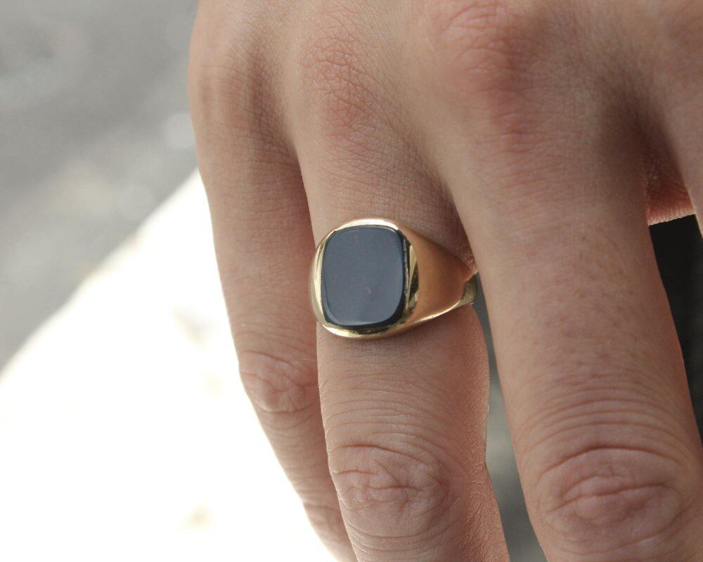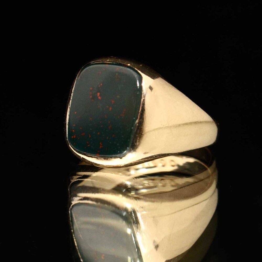 British signet ring. It is the only ring that is allowed to be worn by British gentlemen who wear good things that can be used for a long time without waste as much as possible. The bloodstone top is said to have turned into stone when the blood of Jesus Christ was crucified. It is said to bring spiritual energy from its holiness and is said to have a healing effect. A deep dark green with nice red spots and a dignified look. A very simple design with only a gold body and top that draws a soft curve. 375-9ct gold, 1963 London Assay Office Hallmark. Please check the condition in the photo and understand the characteristics of vintage before purchasing.