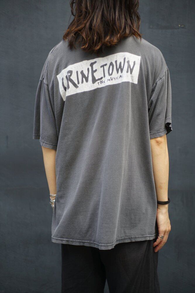 A simple design with a faded black body that looks like a vintage, a logo of the song Dont Be the Bunny and a rabbit, and a Urinetown logo on the back.