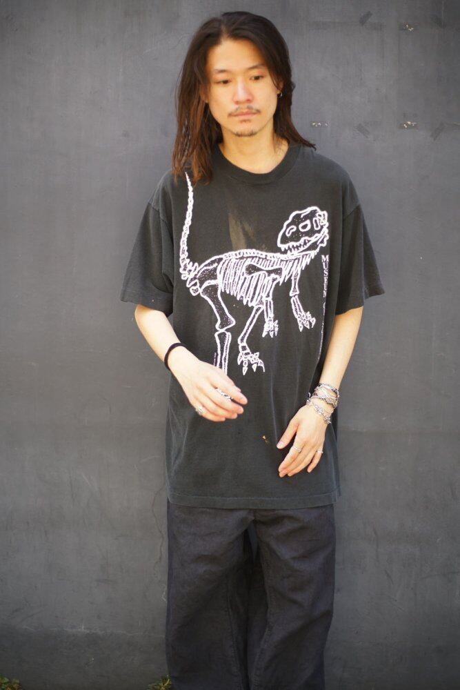 An impactful design with a vintage-like faded black body and a large print of a Tyrannosaurus fossil on the front.