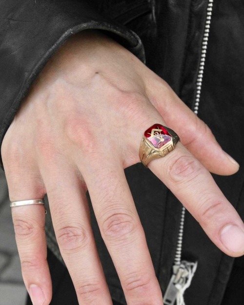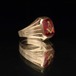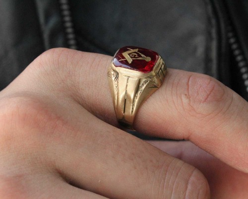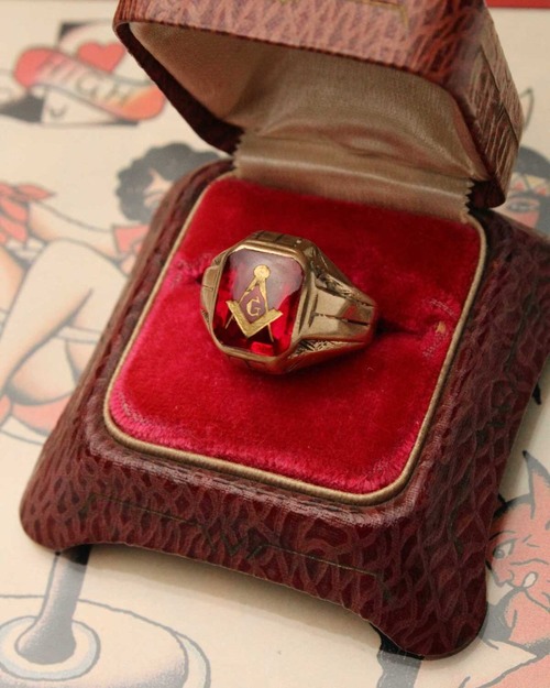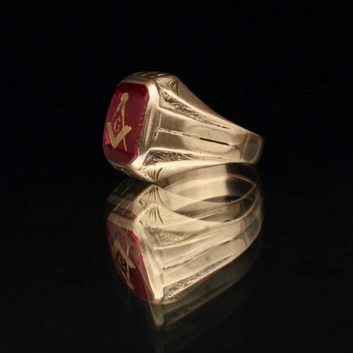 Signet ring with Masonic symbols circa 1930s. A vintage piece with an art deco hoop design, an eye-catching ruby glass, and a classic ruler and compass symbol design. The silhouette is not too big and has a strong presence, making it more stately. Probably 14K gold is placed on a brass or copper alloy, giving it an aged and antique appearance. Please check the condition in the photo and understand the characteristics of vintage before purchasing.