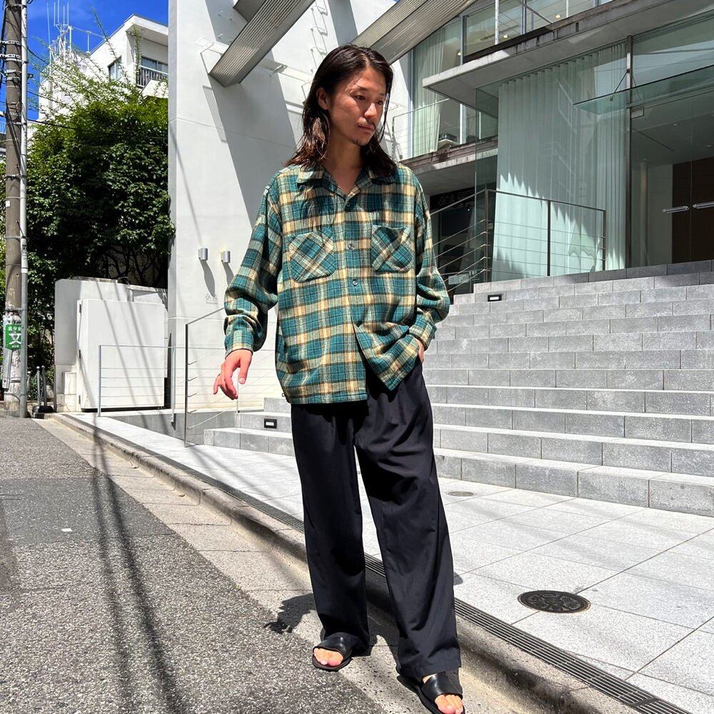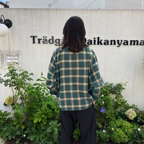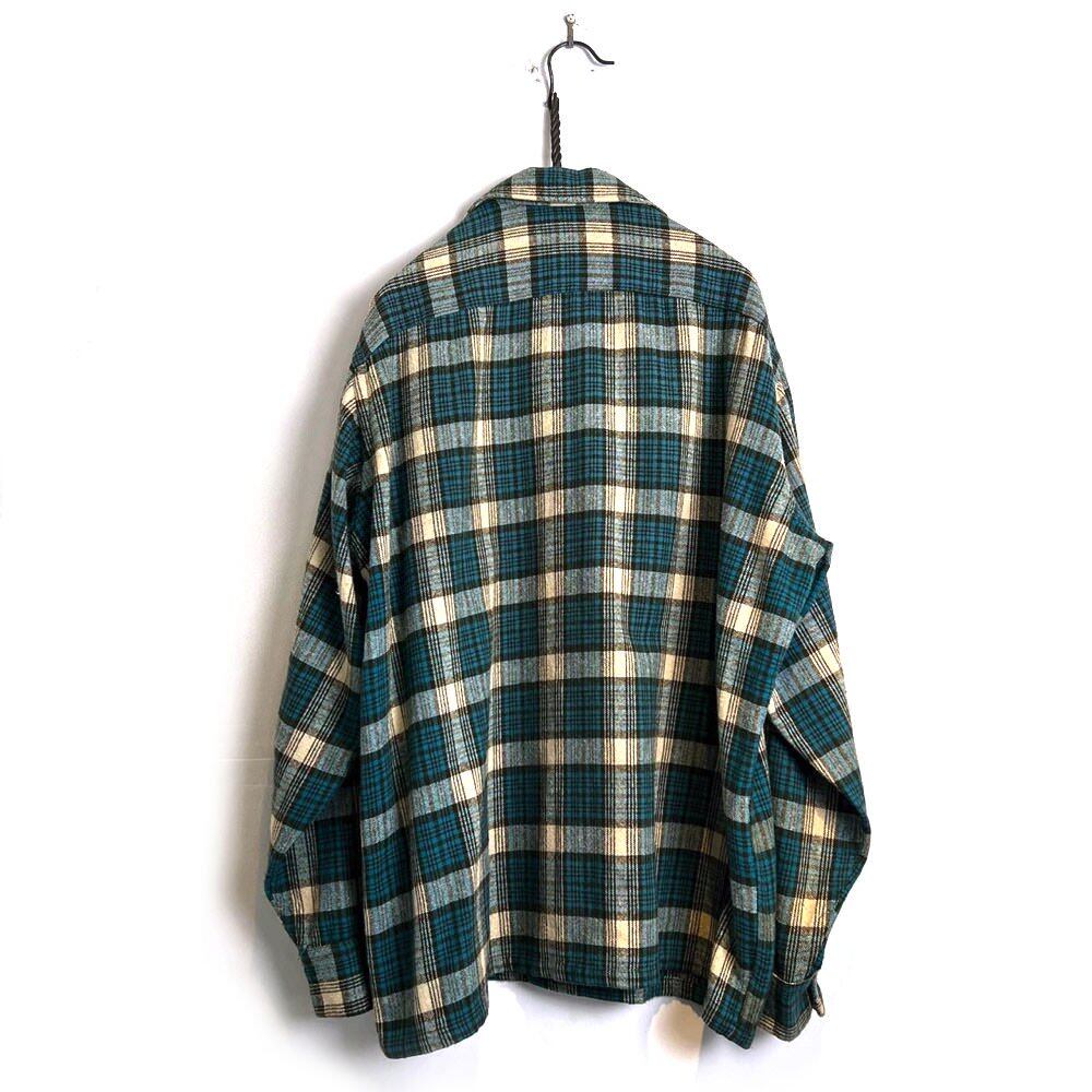 A wool shirt from the 1960s with a check pattern in pleasant colors of turquoise blue, off-white, and black.It has a moderately loose feel and a very nice silhouette.It is made of wool and acrylic material, so it is lightweight and comfortable to wear with less prickly feeling.
