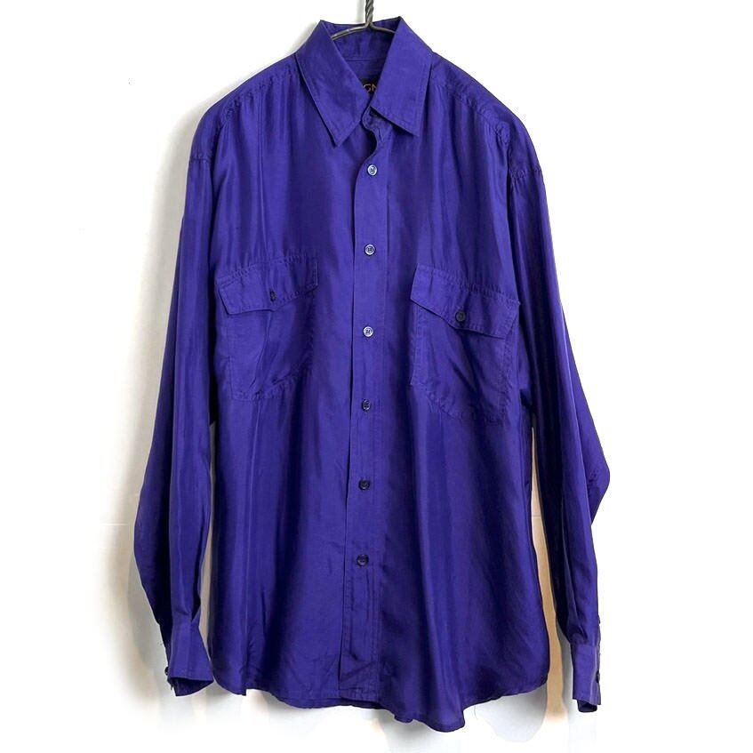 Silk shirt from the 90s 100% silk satin fabric with a smooth texture that is light enough to flutter in the breeze. The vivid purple color also gives it a nice atmosphere.