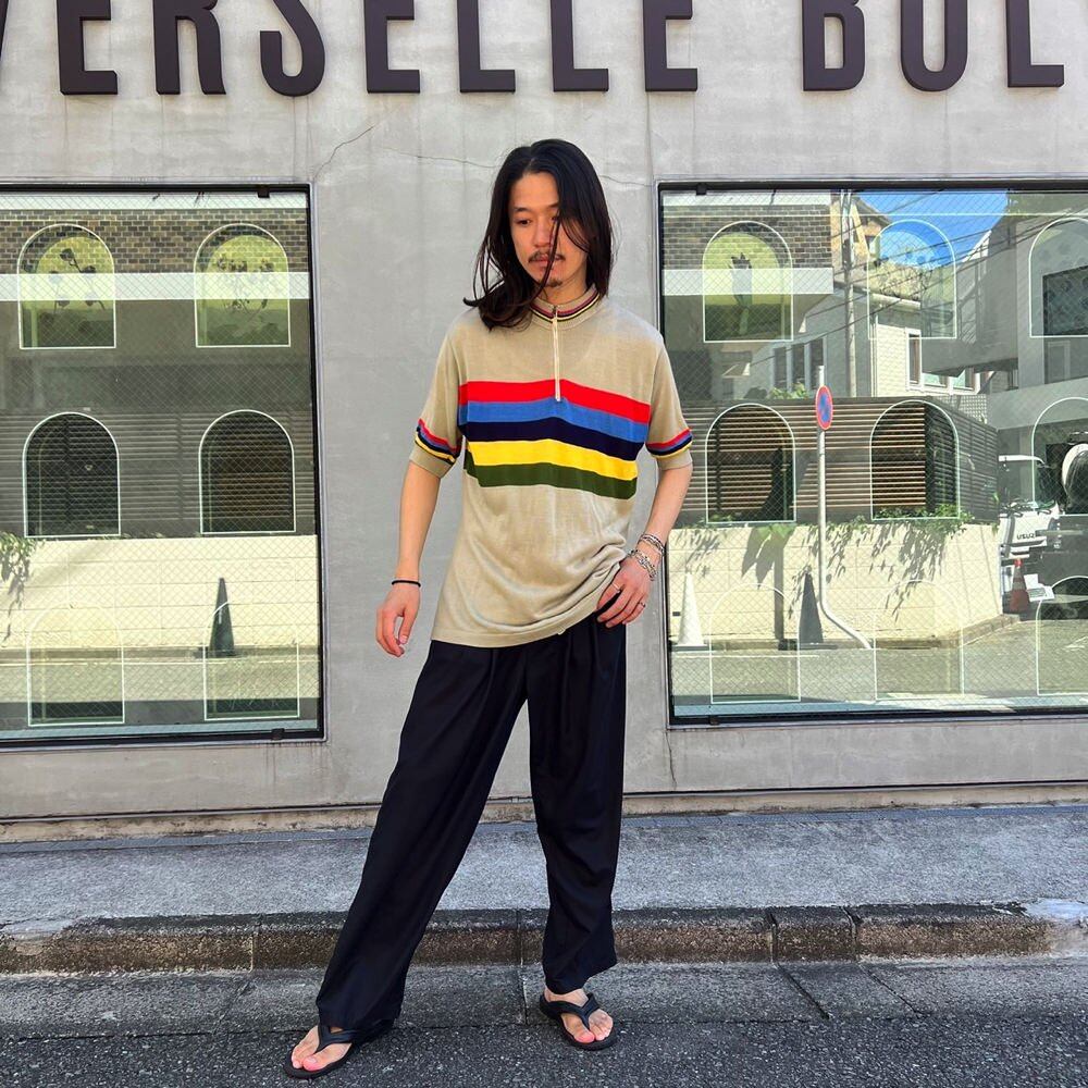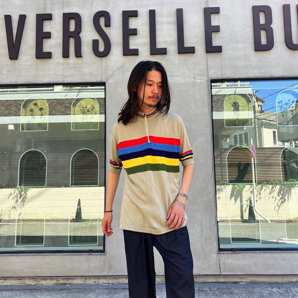 70s knit cycling shirt A grayish beige color base with red, blue, navy blue, yellow, and green multi-border borders giving it a retro feel.The zip-up high neck and pockets on the back give it a neat look with interesting details unique to cycling shirts. Its just the right size, 100% acrylic knit, soft and comfortable to the touch.