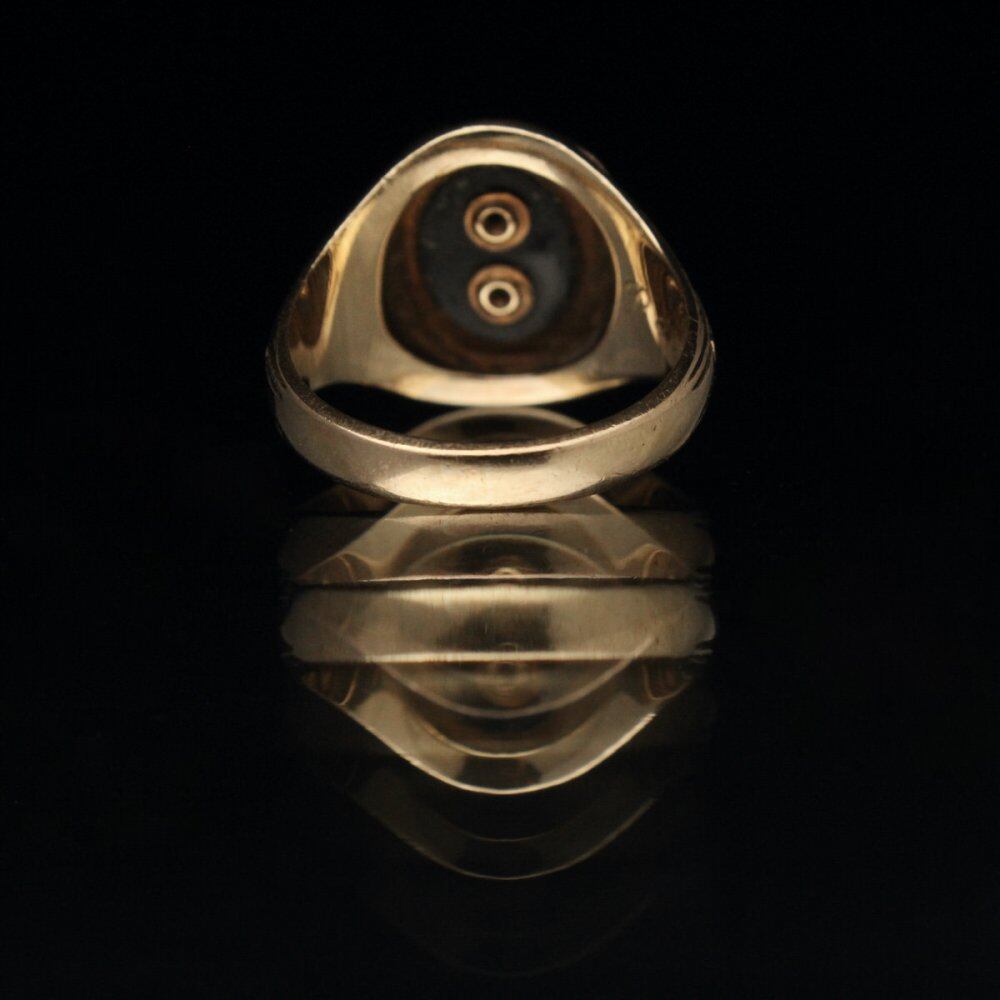 1953 vintage class ring. The humpbacked round silhouette with onyx and the emblem that looks like a charioteer or knight, and the stud-like design is somewhat punky and unusual, and the contrast with onyx gives it a more solid look. Manufactured by the long-established company Herff Jones, engraved in 10 carat gold. Please check the condition in the photo and understand the vintage characteristics before purchasing.