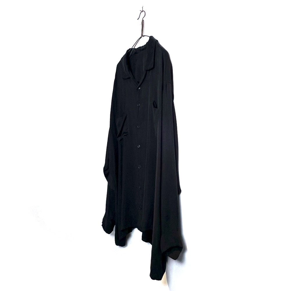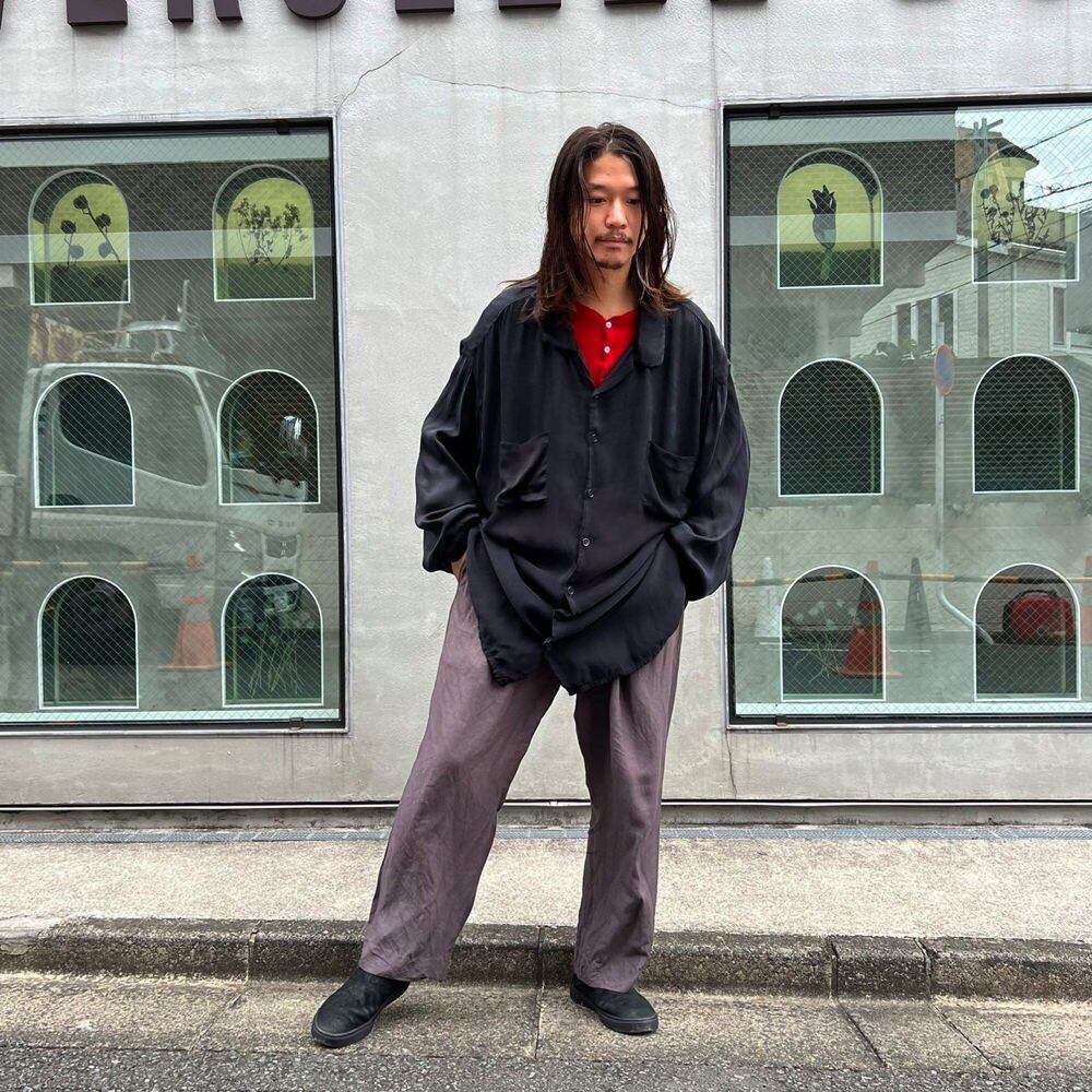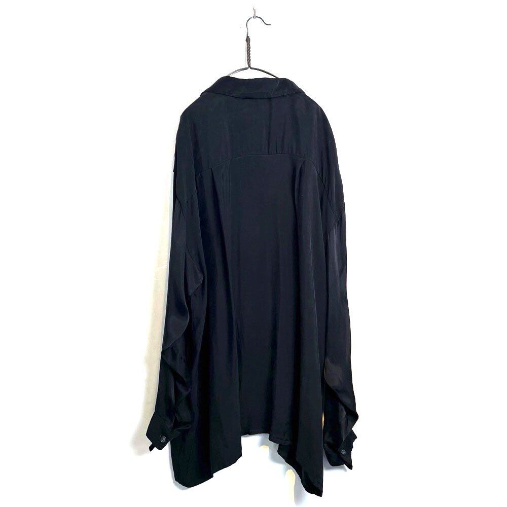 Silk shirts from the 90s There is no size indication, but it has a voluminous super big silhouette that is likely to be around 5XL.The 100% silk satin fabric is just the right thickness for fall and winter wear, creating a luxurious, loose feel.It has a voluminous feel. This piece can also be used as a light coat-like shirt outer.It has a black color that has a slightly worn-in feel over time and is easy to match.