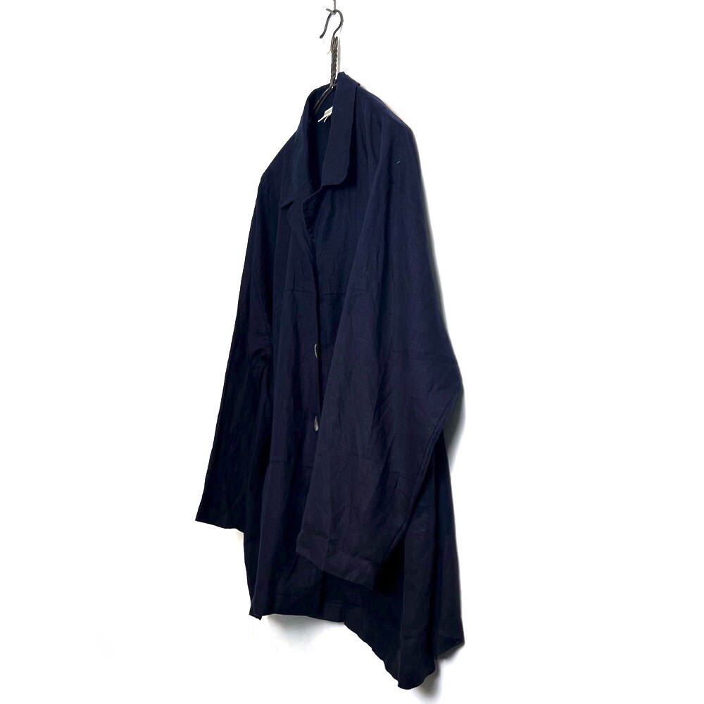 Linen jacket from the 80s.The deep, vivid navy color and texture of the linen fabric give it a mature and classy feel.It is made from one piece with no lining and is lightweight and feels like a shirt.Easy to match. A vintage jacket with a coverall type design that can be used in a wide range of seasons.