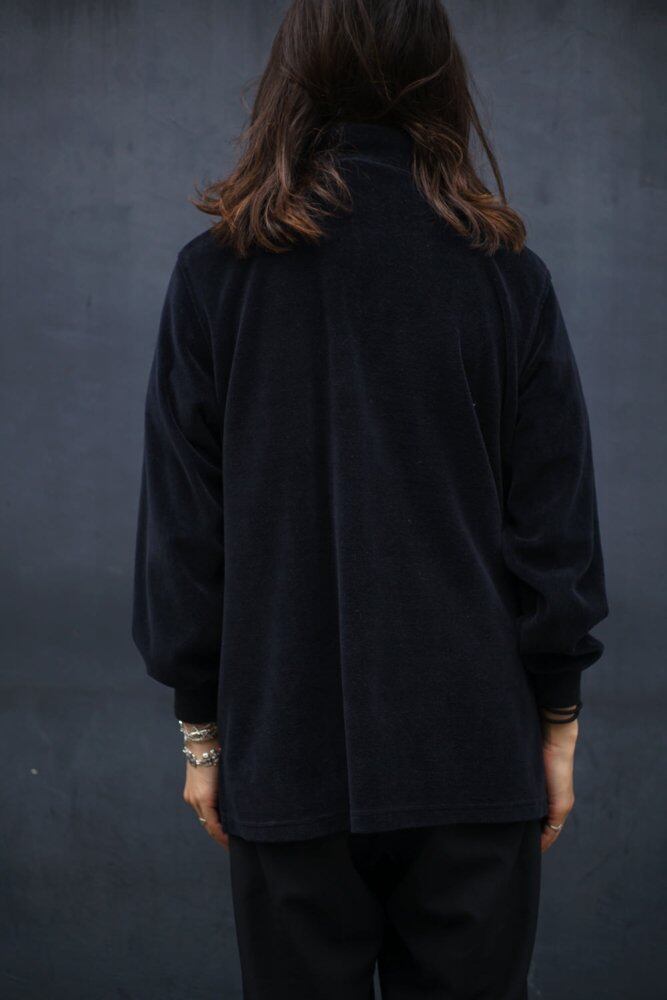A half-zip velor top with an impressive jet black color that stands out from a distance.