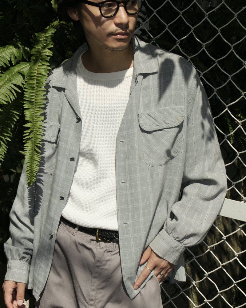 Open collar shirt from the 1960s. A mannish design typical of this era, with a block-like Kasuri pattern woven into a crisp rayon fabric. The ice gray body with black and white kasuri gives it a rustic and calm look. The hand-stitched collar and flap pockets also give it a vintage feel. Rare XL size with a relaxed box silhouette. Since it is an old item, there may be rare cases of deterioration over time. Please check the photos and understand the vintage characteristics before purchasing.
