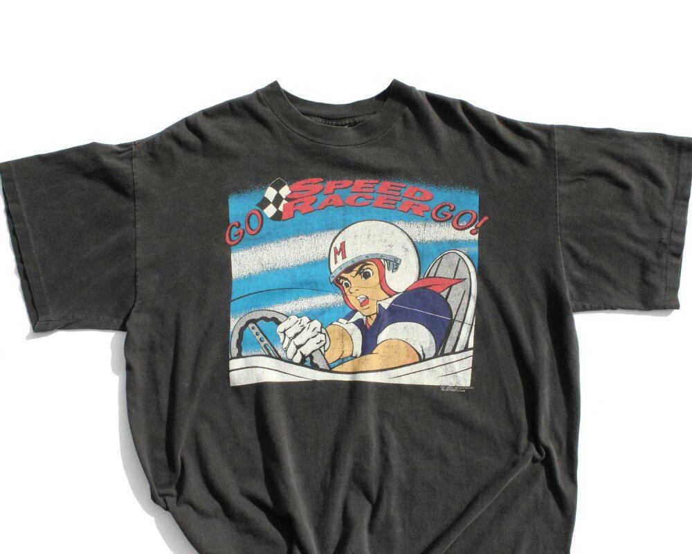 A T-shirt printed with the popular 1960s TV anime Mach Gogogo. This is probably a promotional item from when it was aired in the United States in the 1990s, and the classic comic book print has an impactful design. The beautiful ink black finish has aged well and the thick fabric has a vintage look. Rare XL size with a relaxed silhouette. Since it is an old item, there may be rare cases of deterioration over time. Please check the photos and understand the vintage characteristics before purchasing.