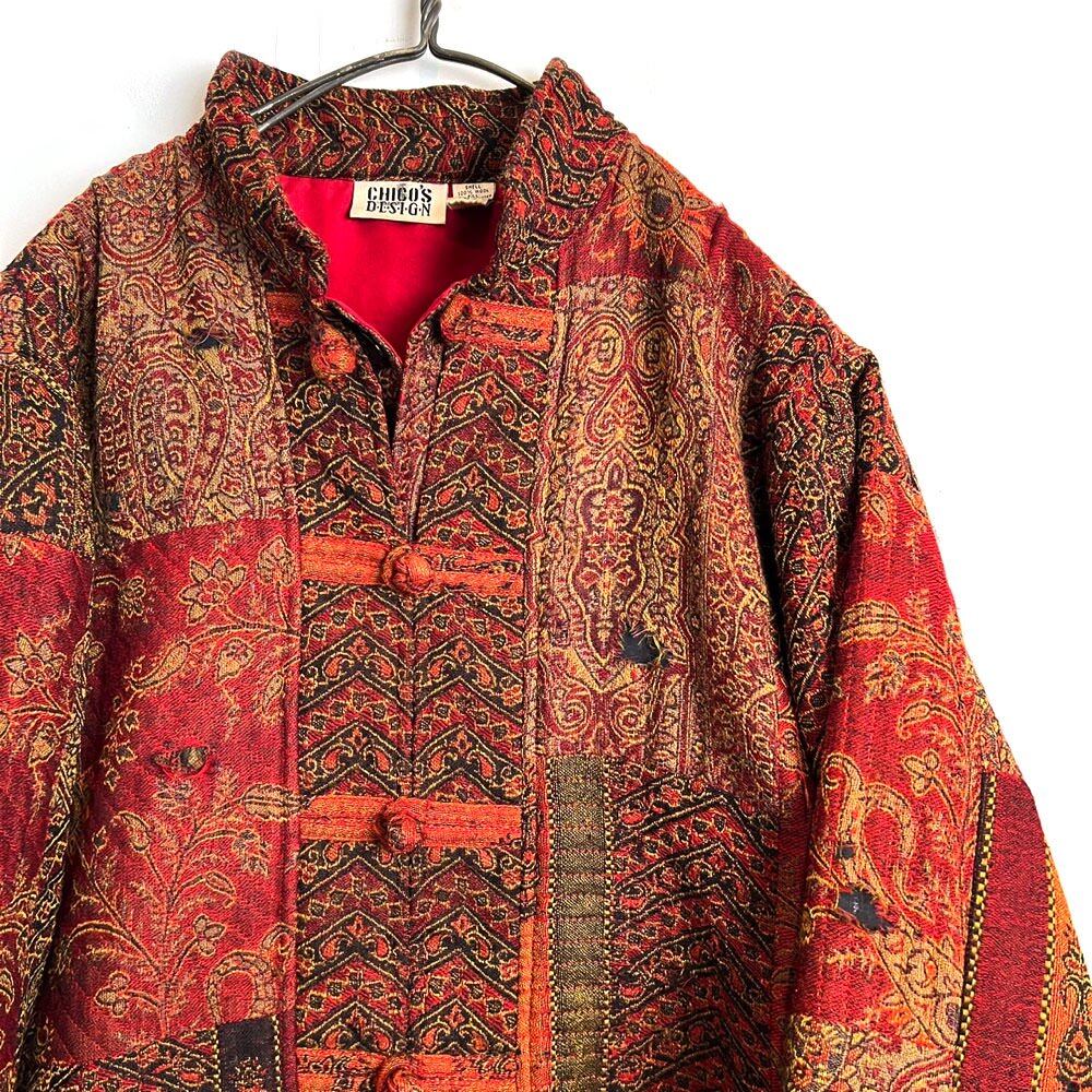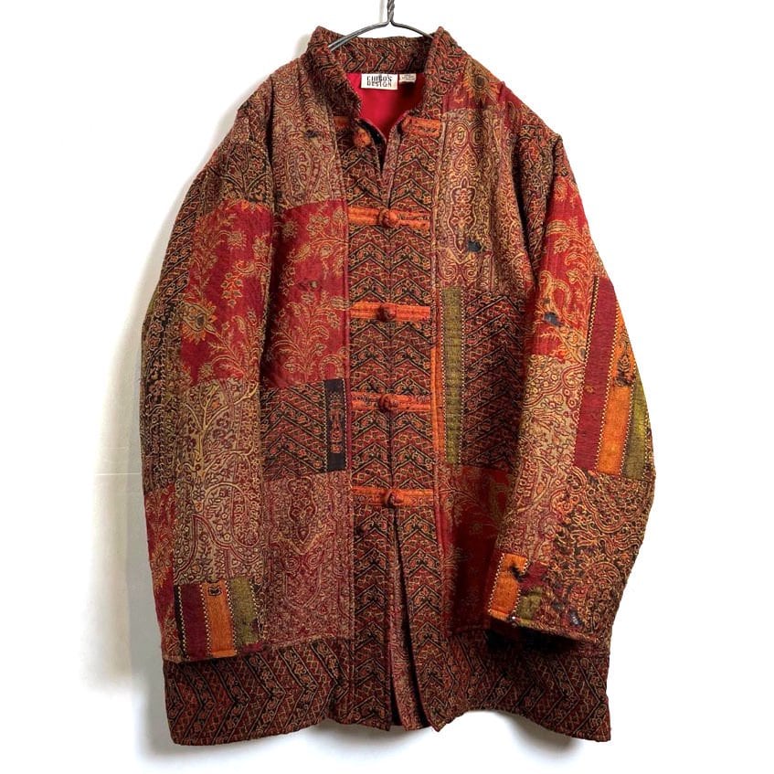 80s Chinese jacket Red, khaki, black, patchwork design of batik pattern with different patterns in tasteful colors