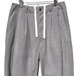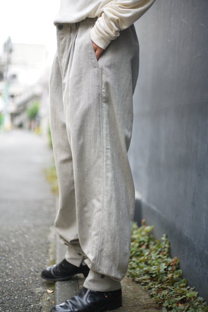 [ALVISTA] 5th Issue. Vol2. Pants created by combining images of various types of mountain troop pants based on the M36 of the German army mountain troop. The silhouette is based on loose hips and a slightly tapered silhouette. By adding a cord detail to the top of the hem and adding an opening to the inner thigh of the hem, it can be worn at night by narrowing it down above the ankle and spreading out along the leg. You can adjust it to a certain extent depending on the shoes you match and your personal preferences. In order to create a beautiful bulge when squeezed, the pattern lines are not tapered, and darts and tucks are placed at the hem. Semi-easy design with a cord running through the back of the waist. Cotton linen back satin fabric with a good texture is used for the waist lining and pocket bag cloth. The buttons are genuine nut buttons made from Tagwa palm.