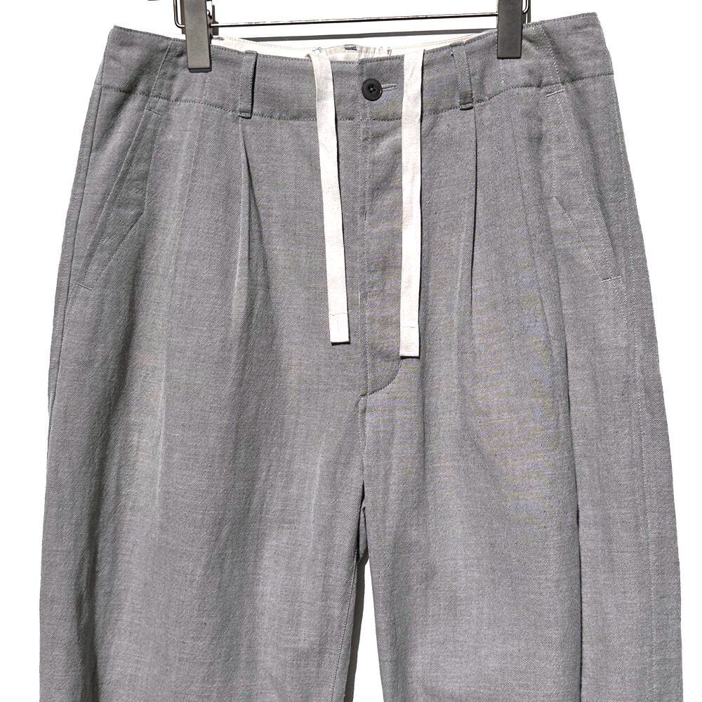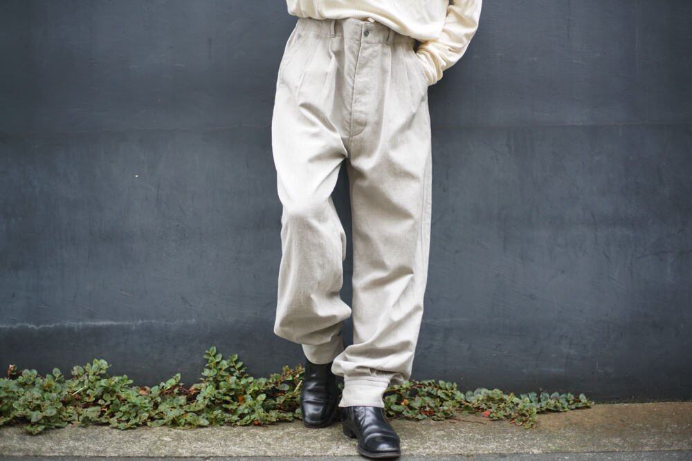 : [60/2 Wool x C/L Twill Tumbler Washer] Twill material using 60 number worsted wool twine for the warp thread and a blend of French linen and cotton for the weft thread. The dry washer finish gives the fabric a drier texture, giving it a natural and rough appearance but with a luxurious feel. Both wool and linen are natural temperature-regulating fibers (wool has low thermal conductivity, blocking cold outside air in cold weather and hot outside air in hot weather. Linen contains air within its fibers, and naturally adjusts to match the outside air. It provides a warming effect.As both are highly hygroscopic fibers, it does not trap too much heat), making it a material that can be worn regardless of the season. In addition, by using worsted wool yarn in the vertical direction, we reduce the disadvantages of linen, such as its tendency to wrinkle.