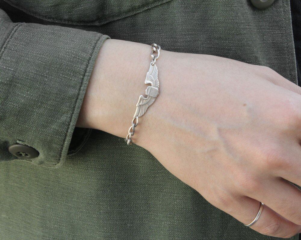 USAF symbol top bracelet. The plate top is not too large and has a casual and elegant construction, and the small size with the Pilot Wings motif gives it a minimalist and cool look. The delicate oval chain also gives it a vintage, run-down look. Recommended size for slender men and women, engraved in sterling silver. Since it is an old item, there may be some scratches, etc. Please check the photos and understand the vintage characteristics before purchasing.