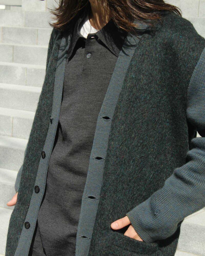 German-made knit cardigan from the 1950s. An unusual design, perhaps reminiscent of a vintage grizzly jacket with a mohair blend fur side and a sturdy jacquard knit. It is lined and has a sturdy silhouette that resembles a tailored jacket. The fur side has a deep coloring using various threads, and the knit side has a mix of colors for a more vintage look. A well-balanced silhouette with plenty of space, which is rare in vintage clothing. There is a stain on the lower part of the back, and there is damage in one spot on the left sleeve, but other than that, it is in good condition considering it is a used item. Since it is an old item, there may be rare cases of deterioration over time. Please check the photos and understand the vintage characteristics before purchasing.