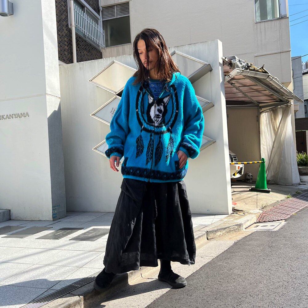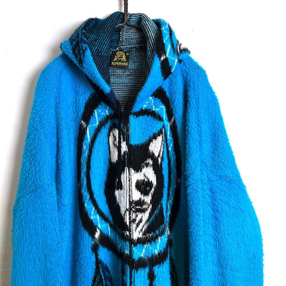 A knit parka made in Ecuador in the 90s.A unique combination of a husky dog and a dream catcher in a bright turquoise blue color.A knit outerwear with a solid texture made of wool and acrylic material.A loose and voluminous oversilhouette.