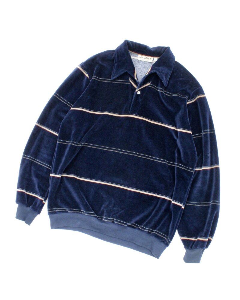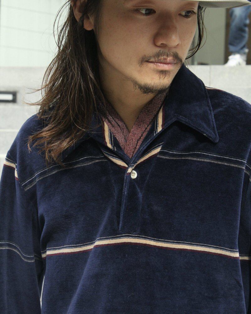 Polo type shirt from the late 1970s. It is probably made of cotton/rayon material, and has a smooth, soft, natural and elegant texture. A design with a dark navy color and a border that makes you feel surf culture. Its a calming piece that doesnt look childish. It has a loose silhouette that is rare in this generation. Although it has some signs of aging, it is in good condition considering it is used clothing. Since it is an old item, there may be rare cases of deterioration over time. Please check the photos and understand the vintage characteristics before purchasing.